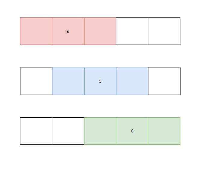 <그림 2. 각 자리의 관계> 위 그림 2는 현재 c번 사람이 앉을 때, 영향을 주는 사람을 나타내는 그림이다. c가 앉을 수 있는 좌석은 초록색 좌석이다. 그런데 좌석에 두 사람이 함께 앉아 있을 수 없다. 따라서, 현재 c가 왼쪽 좌석에 앉는다고 할 때 b가 제자리에 앉아 있거나, a가 오른쪽 빨간색에 앉아 있다면 c는 왼쪽 초록색 좌석에 앉을 수 없다. 만일 c가 제자리에 앉는다고 할 때도 역시 b가 오른쪽 파란 좌석에 앉아 있다면 불가능하다. 그러나, c가 오른쪽 좌석에 앉는 경우는 a와 b 모두 영향을 줄 수 없다. 따라서, 현재 c번 사람이 앉을 때 영향을 주는 사람은 이전에 앉았던 사람과 2번째 전에 앉았던 사람이다.