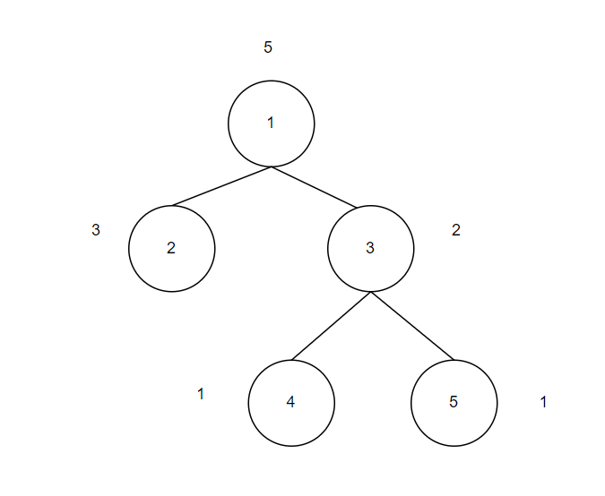 예를 들어, 3번 노드의 경우 리프 노드가 아니기에 자기 자신이 구슬의 종착지는 아니지만, 자신의 자식들인 4번과 5번에 각각 구슬이 하나가 있기 때문에 2개가 된다. 4번의 경우, 리프 노드이기에 자기 자신이 구슬의 종착지가 된다. 그러나, 리프 노드이기에 자식이 없으므로 1개가 된다.