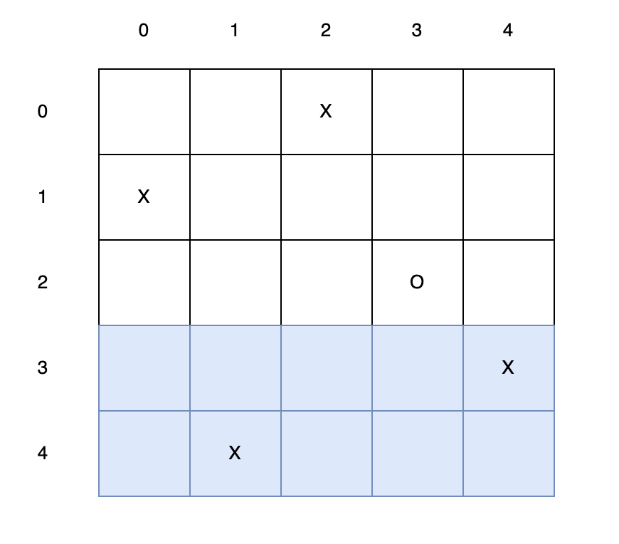 <그림 5. n = 5인 경우> 위 그림 5에서 X는 이미 존재하는 룩의 좌표이고, O는 아직 놓지 않은 룩의 위치인 경우를 나타낸 그림이다. 우선 column을 고정한 채 row를 계산해보자. (3, 0) ~ (4, 4)의 영역에서 룩의 갯수는 2개이다. 그림에서 파란색 영역을 또 다른 사각형이라고 생각해보면, 2 X 5 크기의 직사각형이고, 가능한 룩의 갯수는 min(2, 5)=2개이므로, 현재 파란색 영역에는 마지막 룩을 놓을 위치가 없다.