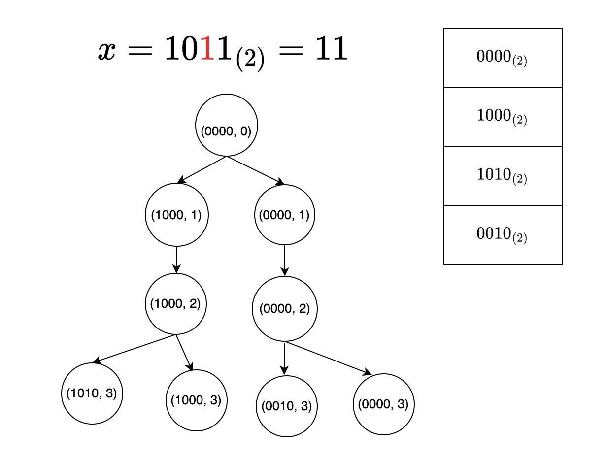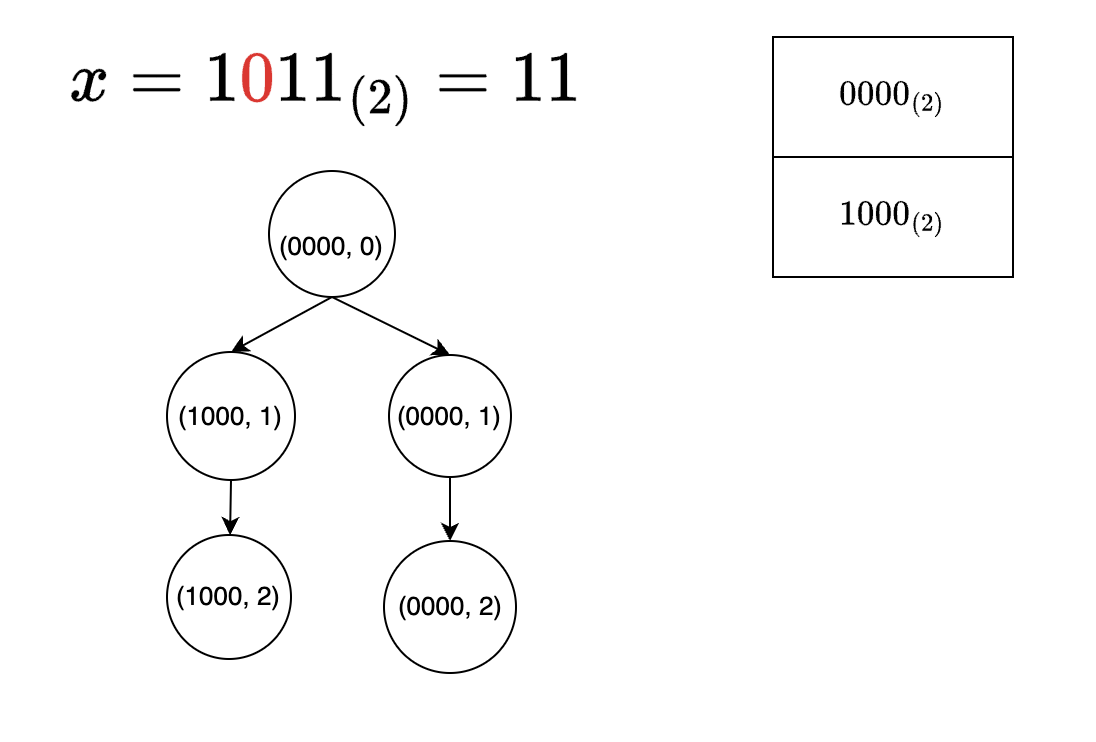 <그림 5. idx = 3일 때> 그렇지 않다. 만약 $0000_{(2)}$를 pruning을 했더라면 위 그림 5에서 $0010_{(2)}$를 얻을 수 없기 때문이다. 따라서 백트래킹을 통해 정답을 구할 수 있다
