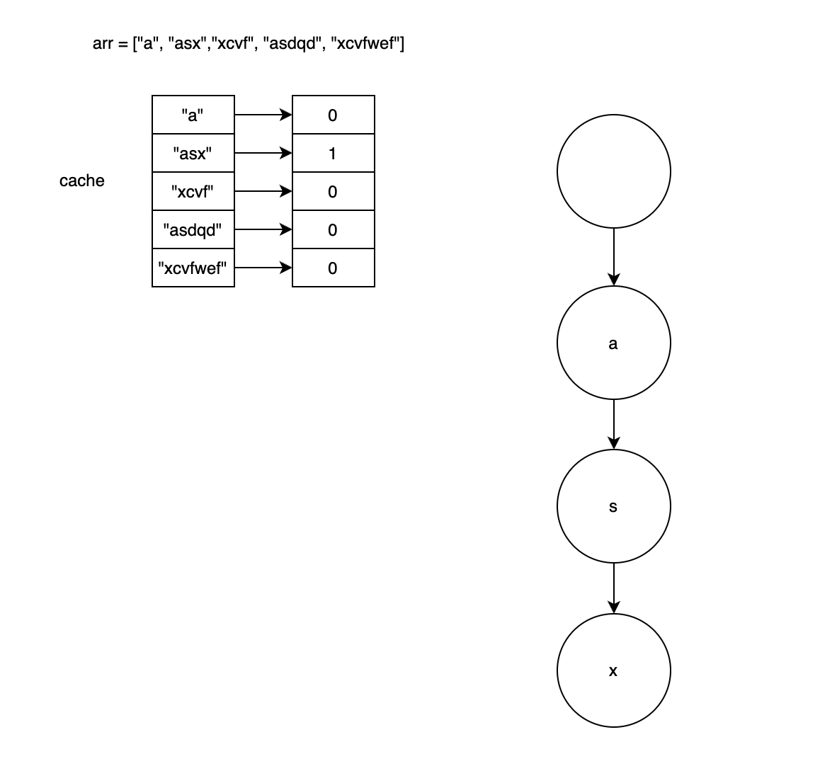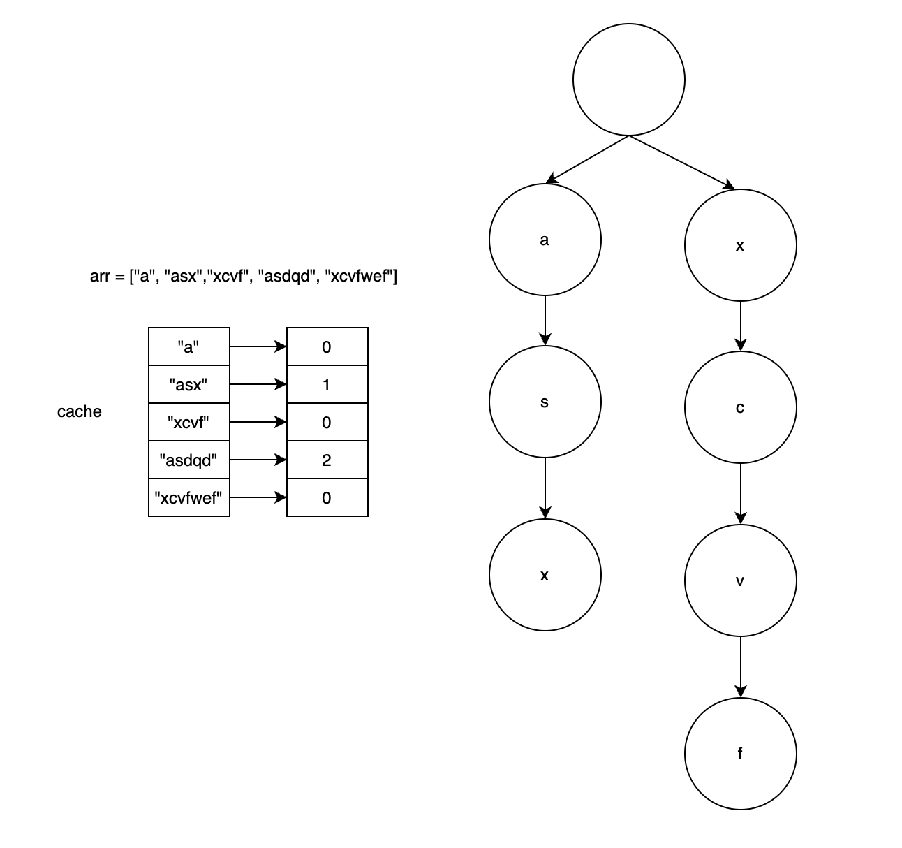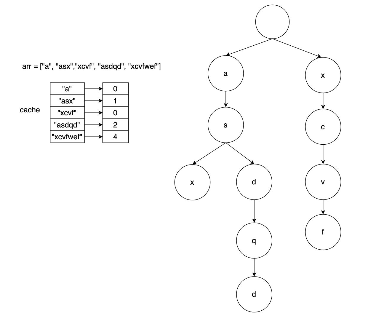 <그림 1. 임의의 예시> 위 그림 1에서 "asdqd"와 가장 길게 매칭되는 prefix의 길이는 2이고, 그 때 매칭되는 문자열은 "asx"이다. "xcvf"와 가장 길게 매칭되는 prefix의 길이는 4이고, 그 때 매칭되는 문자열은 "xcvfwef"이다. 따라서 이런 논리대로 정답을 구하면 2, 4, 1, 2, 4가 된다. 가장 길게 매칭되는 prefix의 성질을 이용하면 이분 탐색을 이용하면 시간안에 정답을 구할 수 있을 수도 생각할 수 있다. 그러나, n의 길이가 50만이고, 전체 문자열의 길이의 합 역시 50만이기 때문에 이분 탐색을 쓴다고 해도 시간 초과를 피할 수 없다