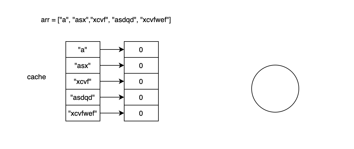 <그림 1. 첫 글자를 트라이에 삽입하는 경우> 위 그림 1에서는 정렬된 arr에서 첫번째 글자인 "a"를 트라이에 삽입하는 경우를 나타낸 그림이다. 당연히 아직 트라이에 아무것도 삽입된 게 없으므로 현재 글자인 now와 매칭되는 최대 prefix길이는 0이 된다. cache는 arr에 있는 문자열을 key, 최대 prefix 길이를 value로 갖는 dictionary이다
